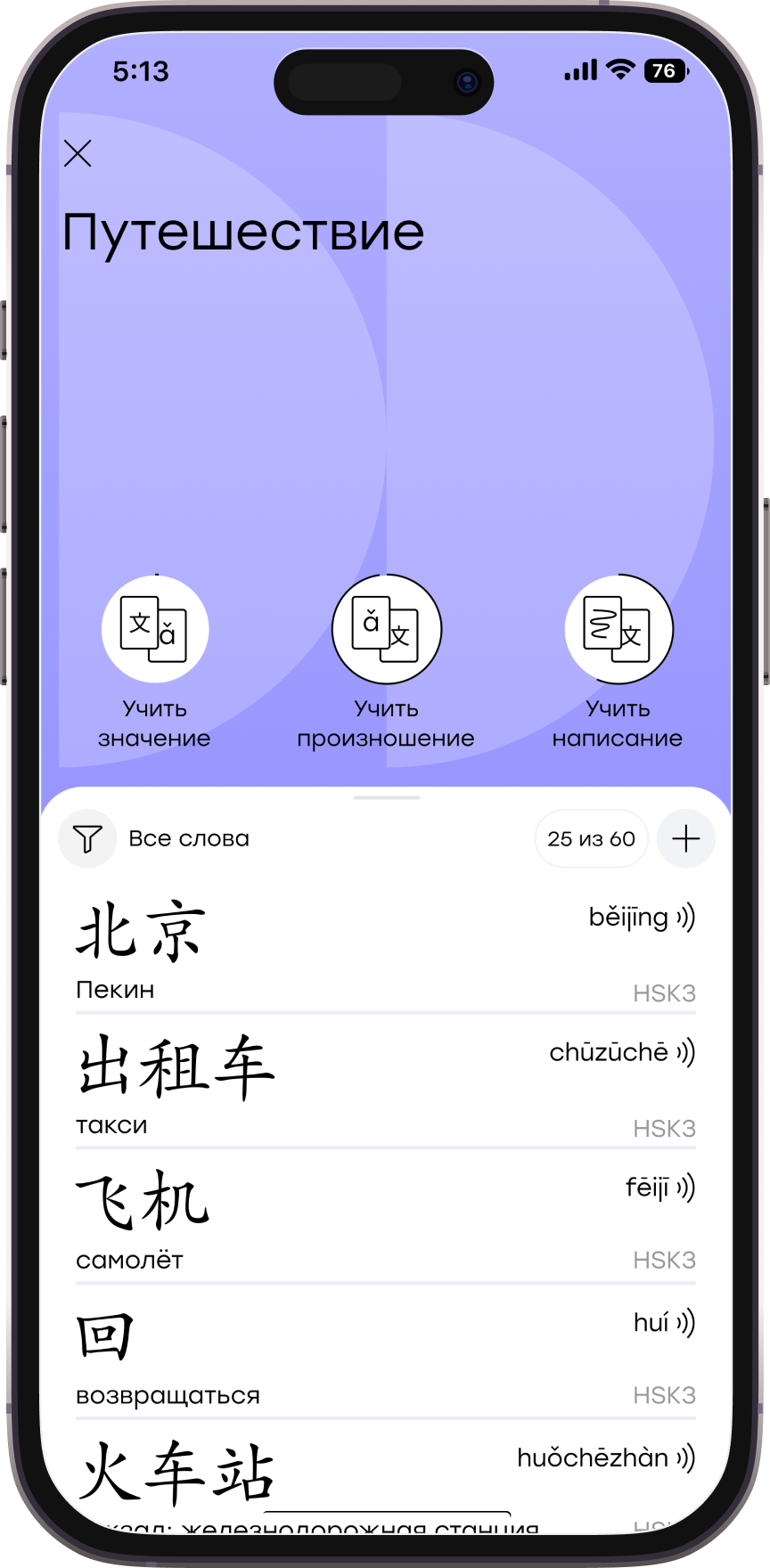 Учи слова по карточкам, запоминай тоны и прописывай иероглифы прямо в приложении. Запоминай слова по методике интервального повторения. В Лаоши есть списки слов из более чем 180 учебников китайского.